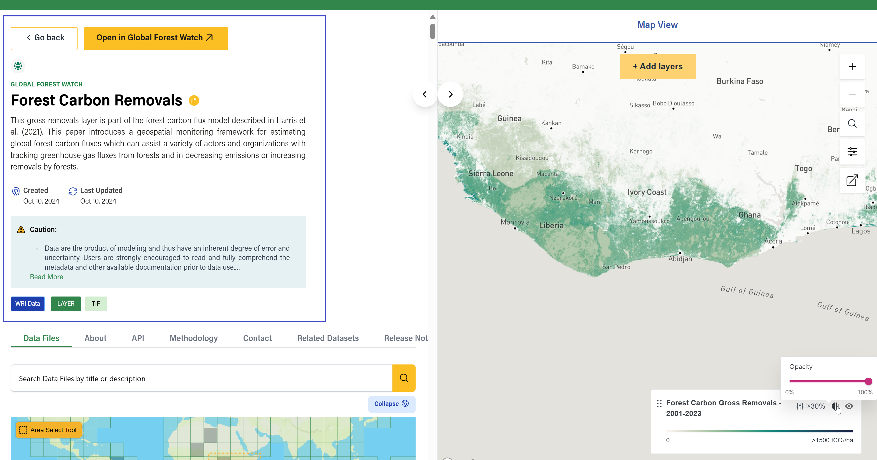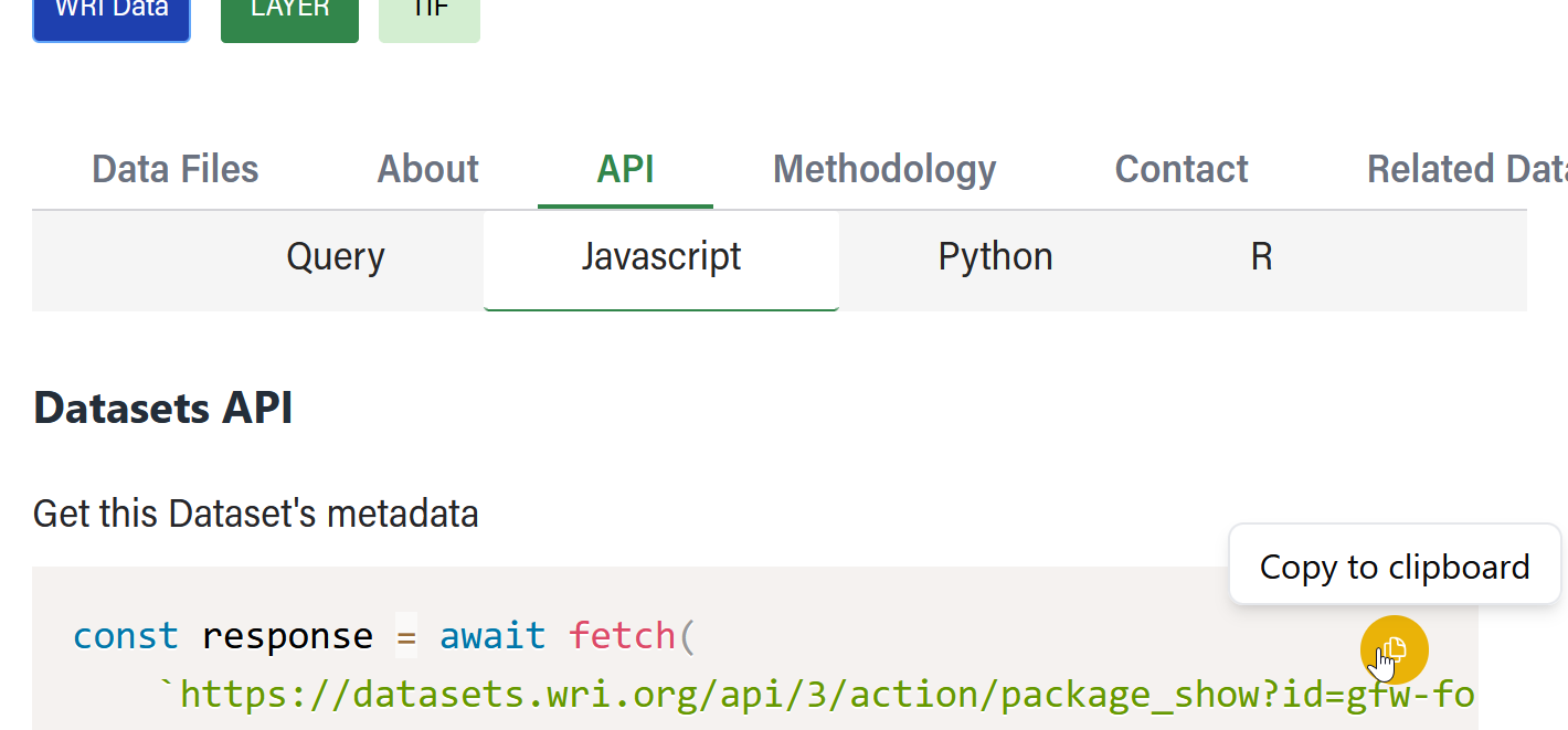 For more information on the CKAN API, see the CKAN API documentation. For the Datastore API, see the Datastore API documentation. Also, see GFW API key documentation to generate an API token to access the raw file.