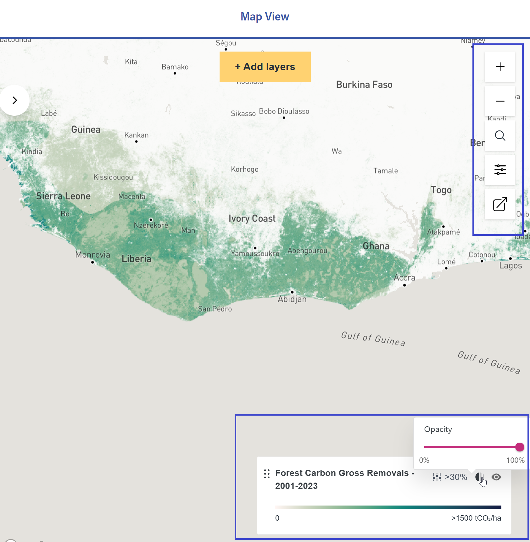 - Legend – Reorder, hide, or change opacity of layers; select a different threshold value (if other thresholds are available)