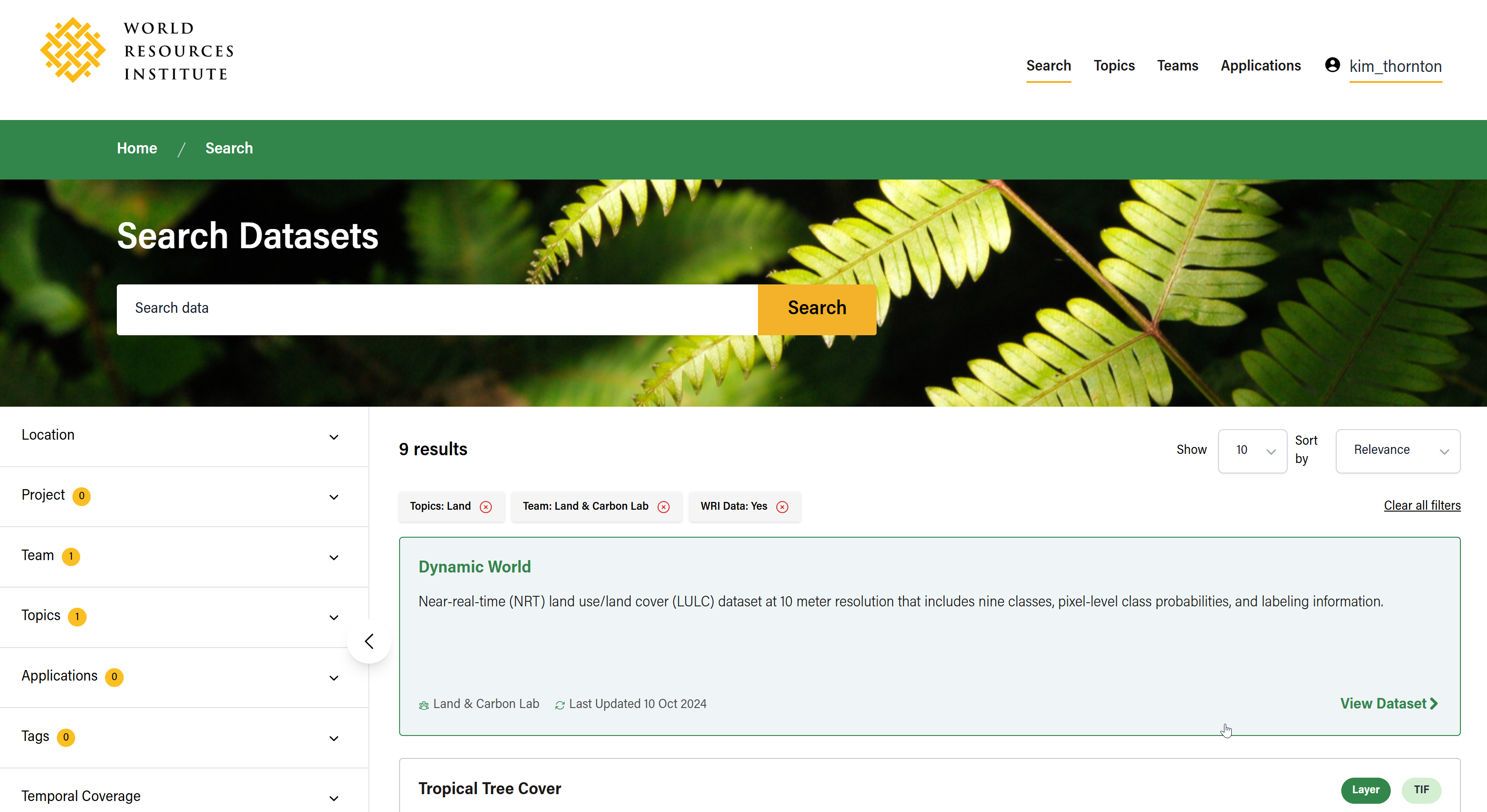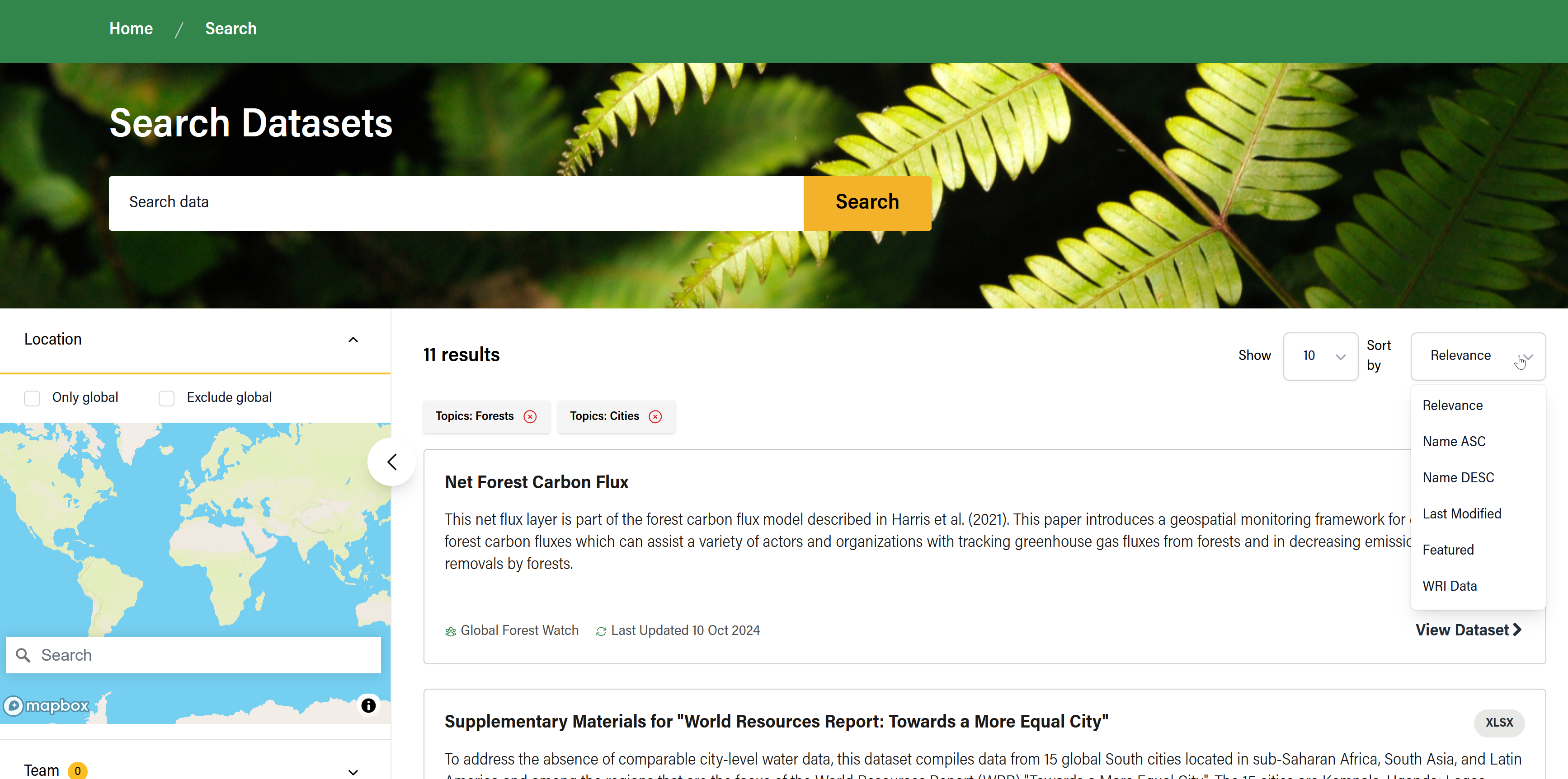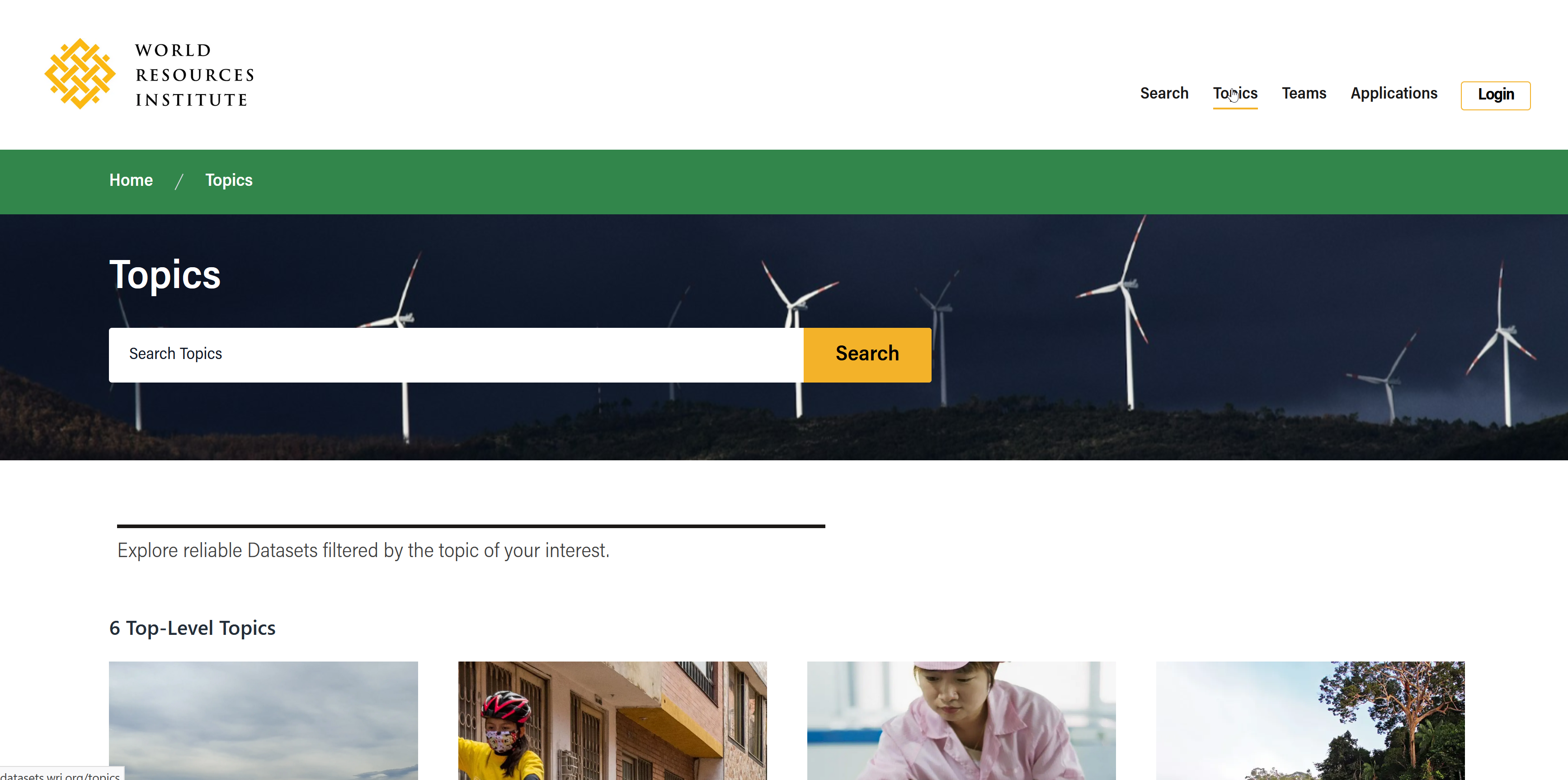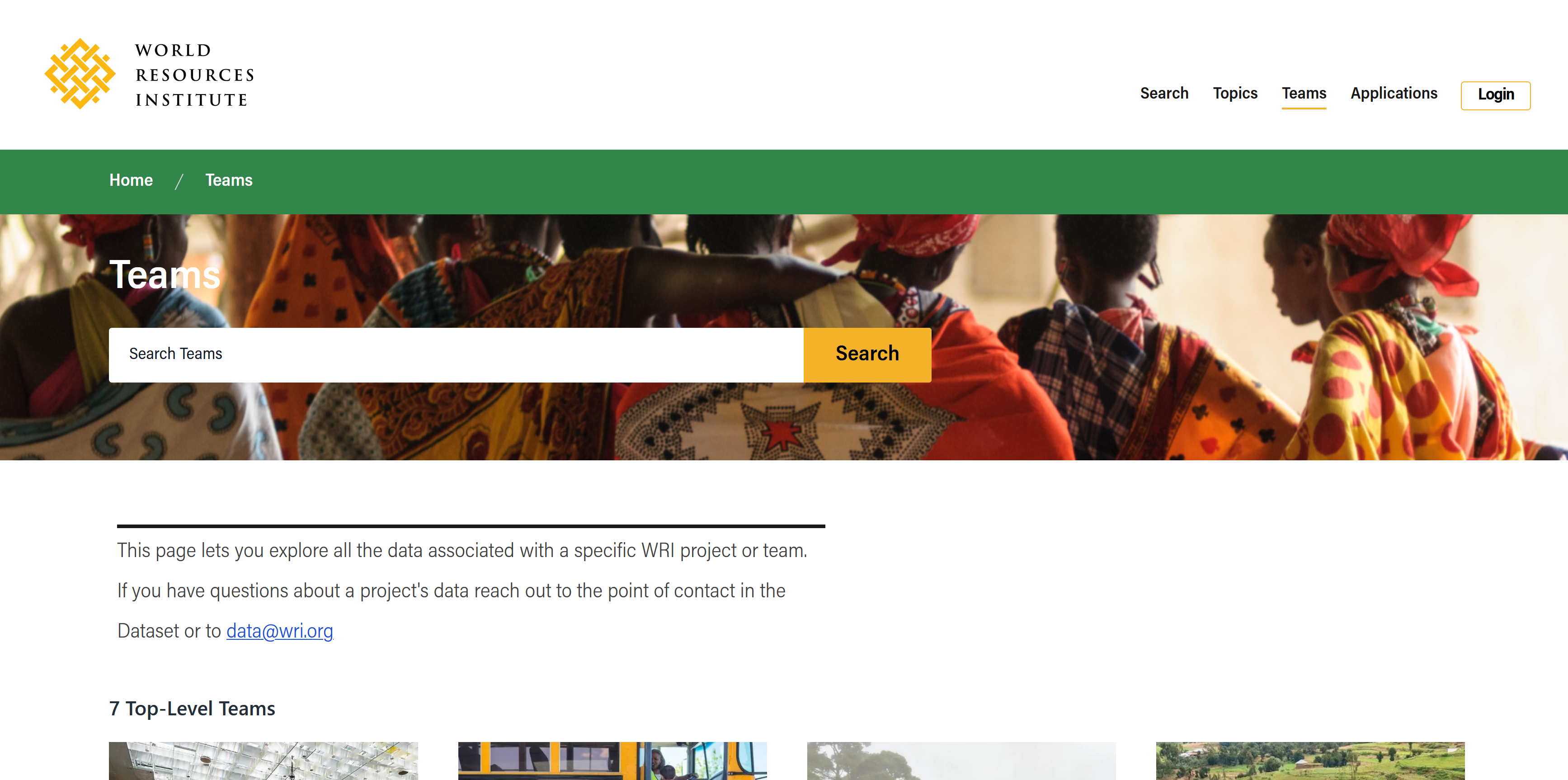 You can browse datasets by the WRI Team that owns them. A Team is the organizational unit responsible for publishing and maintaining a dataset. In many cases, a Team represents a larger program or project team at WRI and can have Sub-Teams nested within them. A dataset can only belong to one Team (or Sub-Team).