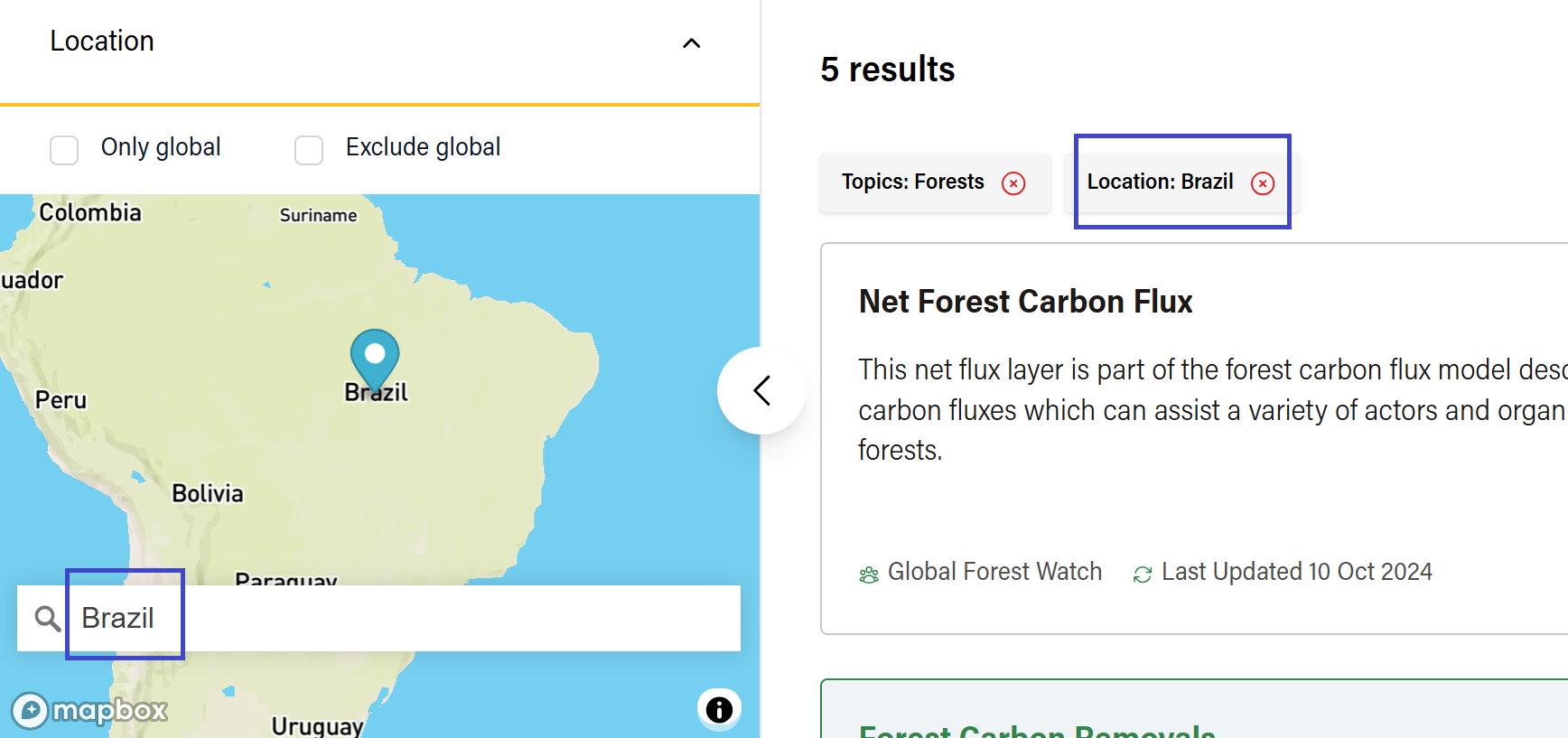 If you are trying to narrow down geospatial datasets for a particular geography, you can also filter by location. Expand the ‘Location’ filter from the filter menu to expose a map widget (powered by Mapbox) and complete an autocomplete text search to match data files against geography names or addresses.