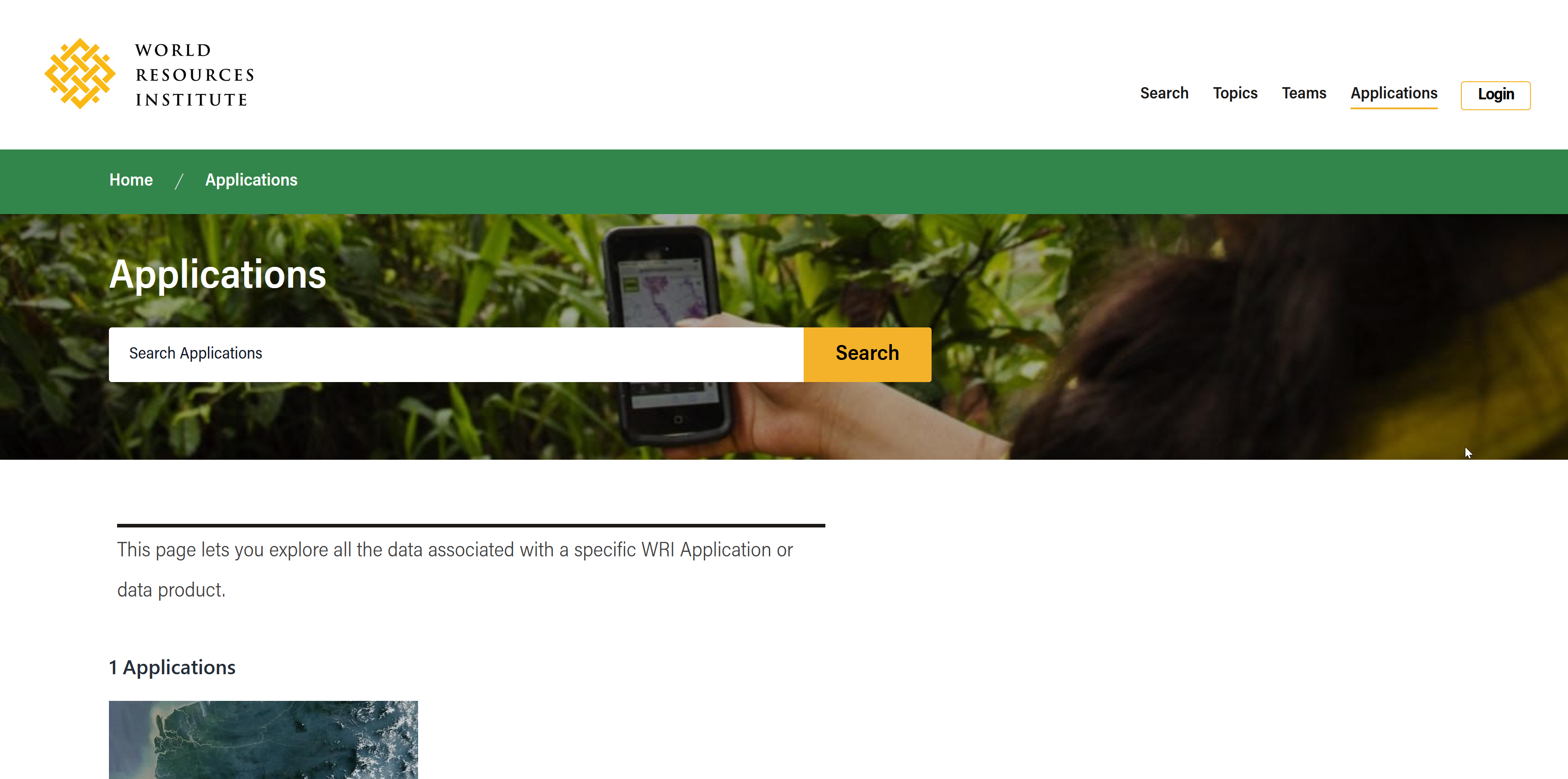 Applications are WRI-owned platforms or digital products that use datasets also listed in the Data Explorer. In many cases, the application may be involved with the publication of the dataset or have a direct connection to the Team that owns it (they may even be the same entity). Unlike with Teams, a dataset can be associated with more than one application.