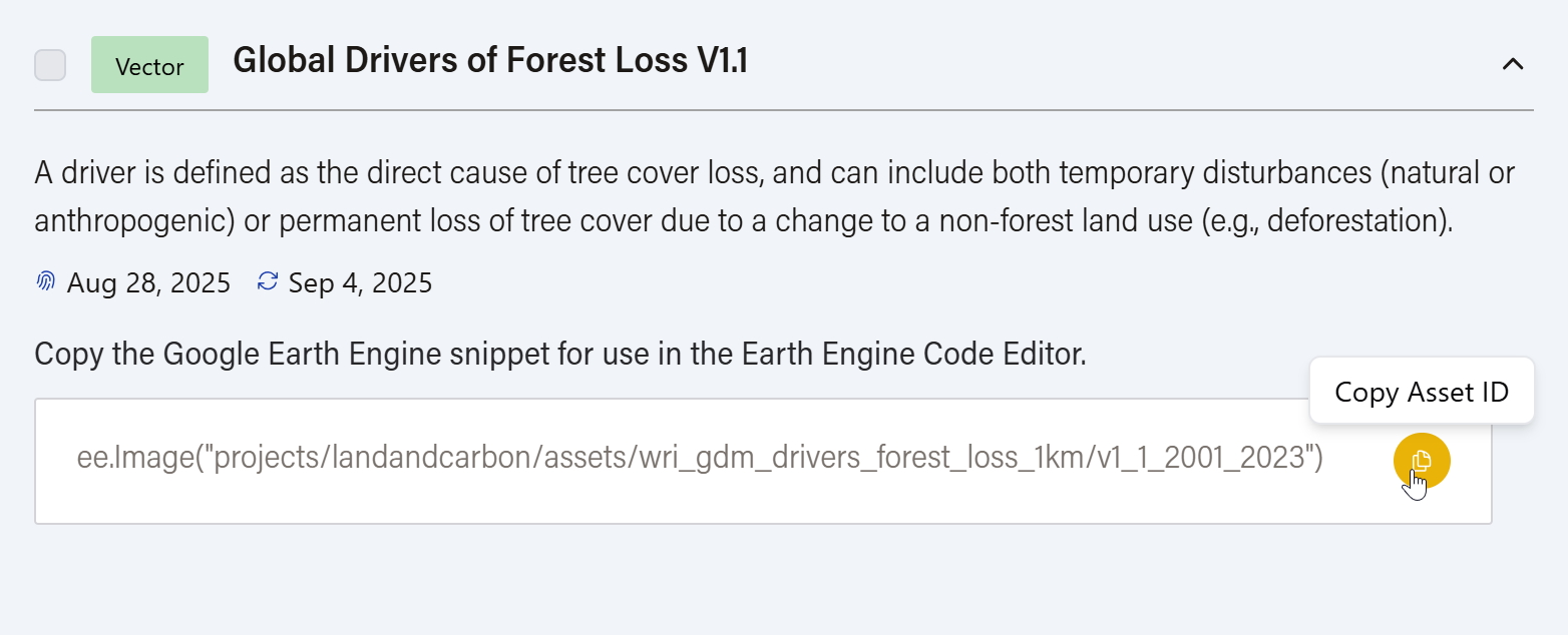 For data that lives on Google Earth Engine, a similar “copy to clipboard” input will appear. Instead of a URL, the copy button will grab the GEE asset ID, which can be used in GEE’s Editor.