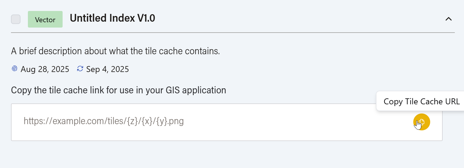 For data stored on a tile cache server and not easily accessible in a browser or as a download, you will see a “copy to clipboard” input instead of a large button. Simply hit the copy button to grab the provided URL for use in your GIS application of choice.